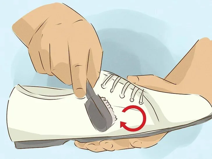 - سر مسواک را در محلول ایجاد شده فرو کنید و با حرکات دایره ای روی سطح کفش، نسبت به پاک کردن لکهها اقدام نمایید.